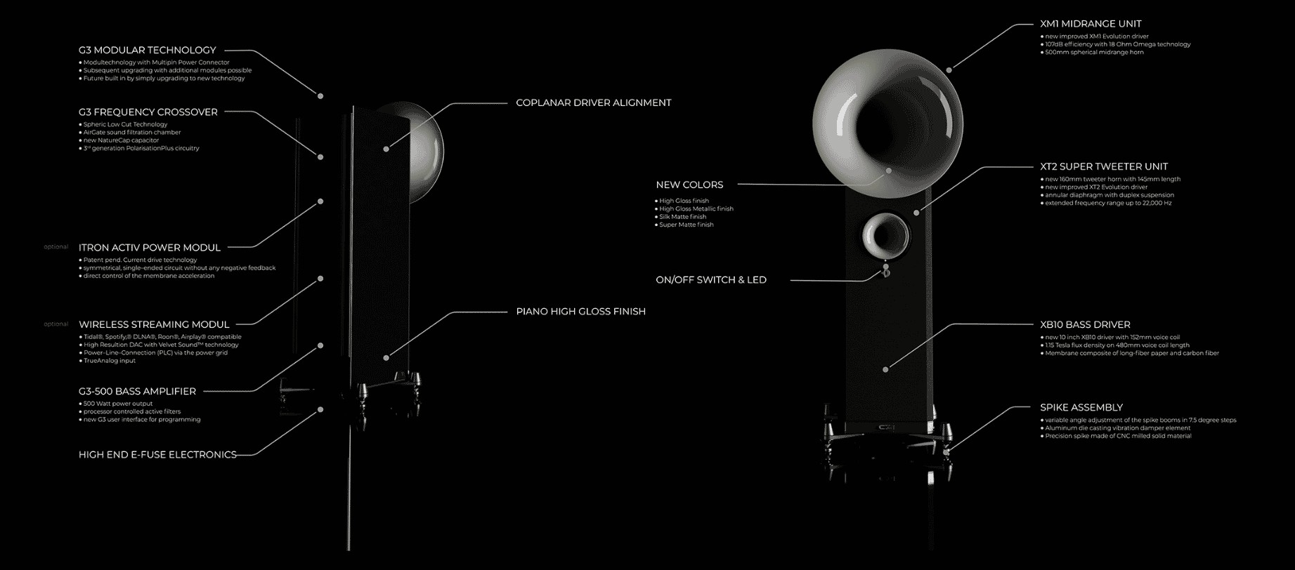- Корпус с отделкой рояльным лаком, новые элегантные варианты расцветки и дизайна для индивидуальной конфигурации акустики вашей мечты.
