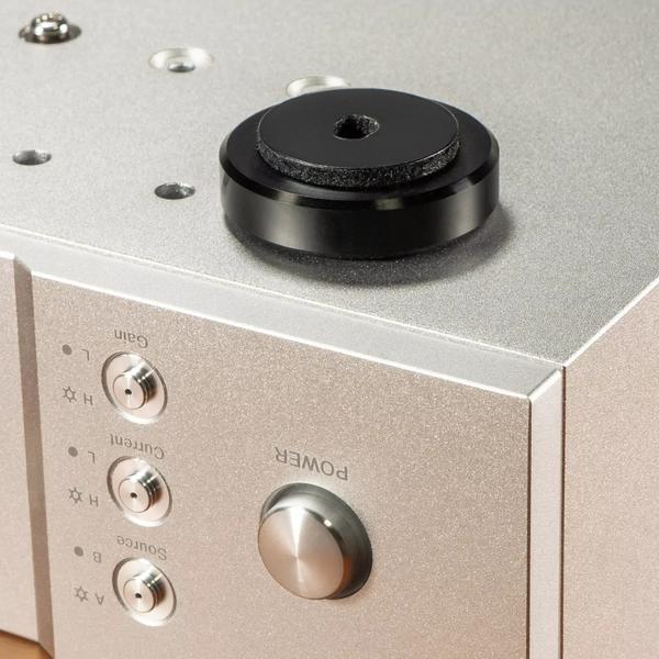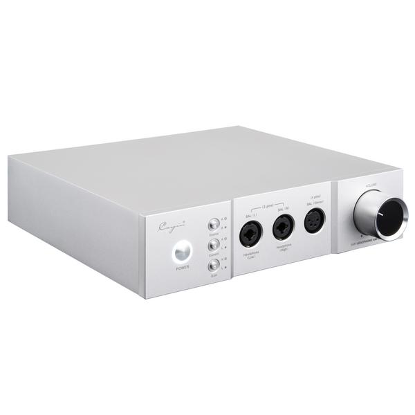 На фронтальной алюминиевой панели аппарата находятся крупная рукоятка регулировки громкости, а также выходы для подключения наушников. Они реализованы на двух 6,3-мм разъемах и одном 4-контактном XLR. К 6,3-мм разъемам можно подключать небалансные модели со штекером TRS, при этом левое гнездо рассчитано на подключение наушников с низким значением импеданса, а правое – с высоким. К этим же гнездам подсоединяются и балансные модели, кабель которых оснащен парой 3-контактных штекеров. 4-контактное гнездо XLR можно использовать для прямого подключения совместимых балансных моделей.