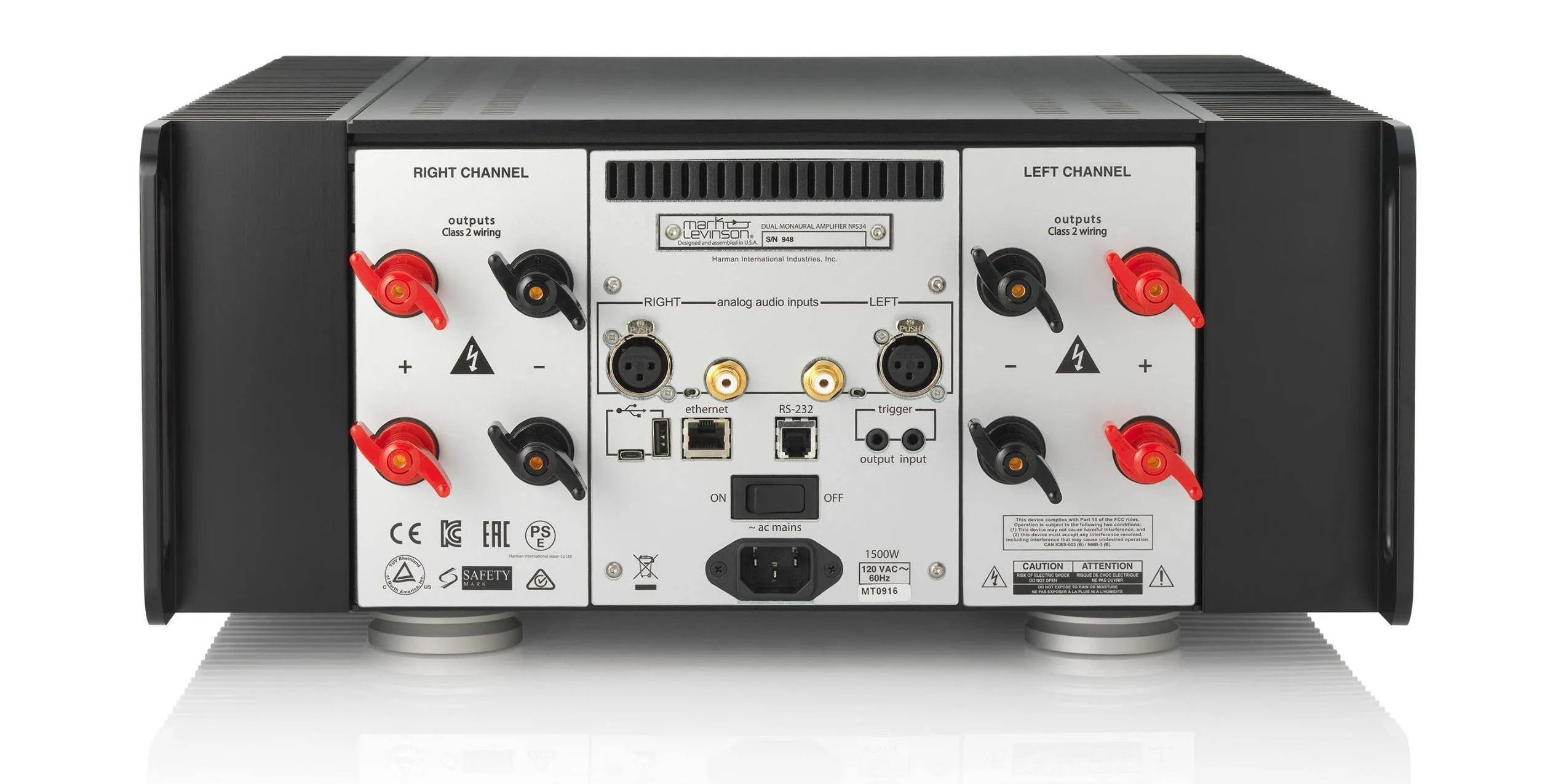 Модель Mark Levinson №534 имеет тяжелый корпус из экструдированного алюминия (сплав 6063-T5) и отличается высокой точностью сборки с предельно малыми допусками. Усилитель оснащен балансными, а также несимметричными входами. Для подключения АС служат четыре пары винтовых позолоченных терминалов с фирменными фиксаторами Hurricane, с помощью которых можно организовать двухпроводное подключение колонок. На борту имеются триггерные разъемы (вход/выход), интерфейс RS-232, USB-порты и LAN-порт, благодаря чему оконечник легко интегрируется в систему «умного дома» или в локальную сеть, а его настройки при этом можно изменять, используя веб-страницу.