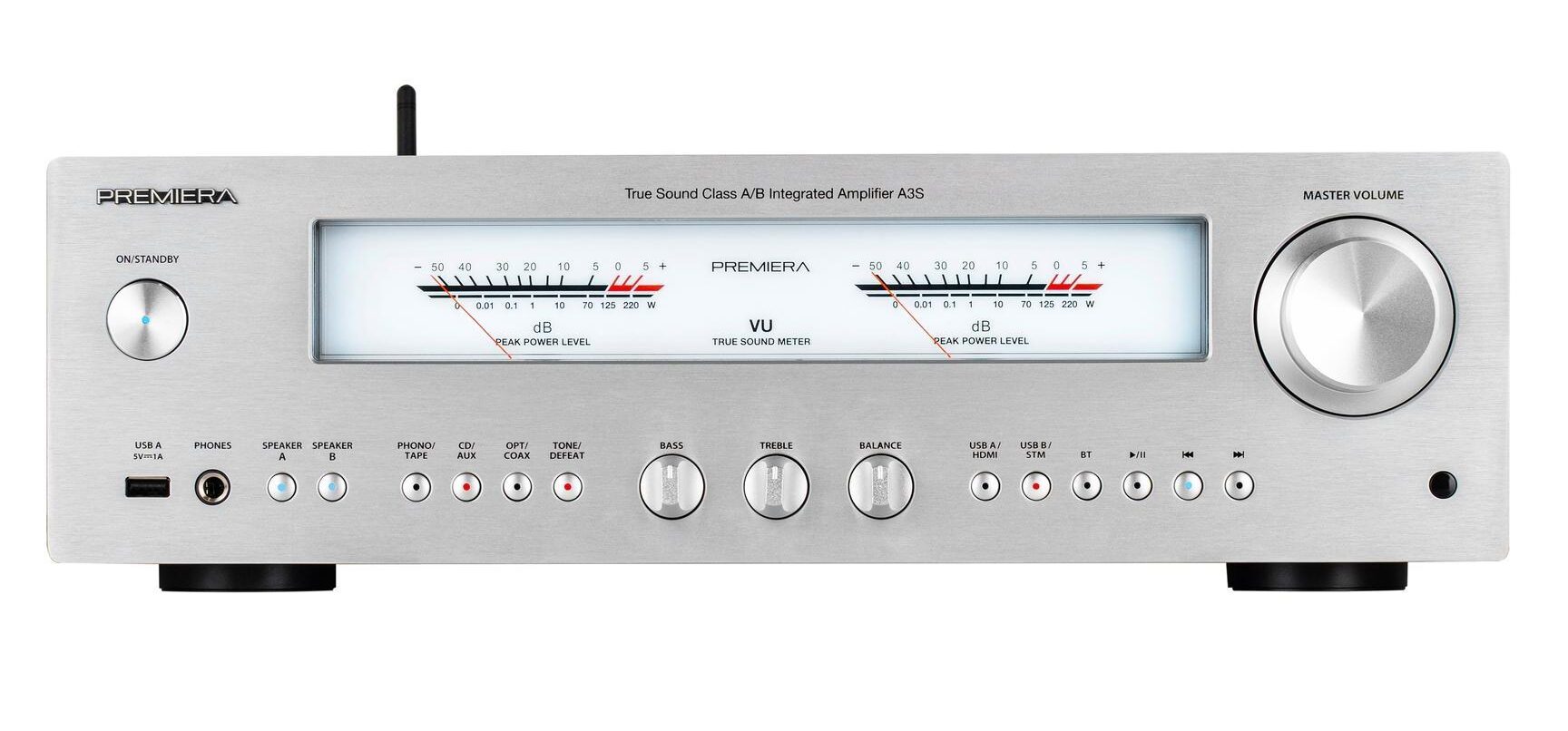 Premiera A3S – современный интегральный Hi-Fi стереоусилитель класса AB со встроенными сетевым проигрывателем, MM/MC фонокорректором, ЦАП, Bluetooth, HDMI ARC, Wi-Fi и AirPlay 2, с номинальной выходной мощностью 110 Вт на канал. При общей сдержанности дизайна, свойственной всем устройствам Premiera, A3S выделяется своими крупными и яркими стрелочными VU-индикаторами вместо дисплея на лицевой панели и ручками темброблока под ними. Эти два элемента придают модели нео-винтажный вид, столь модный сегодня. При этом управление усилителем без дисплея и меню не стало менее удобным – кнопки и потенциометры прекрасно справляются, даже сложные процедуры вроде обновления ПО или возврата к заводским установкам можно провести, используя комбинации кнопок на лицевой панели. К тому же всегда поможет пульт дистанционного управления.