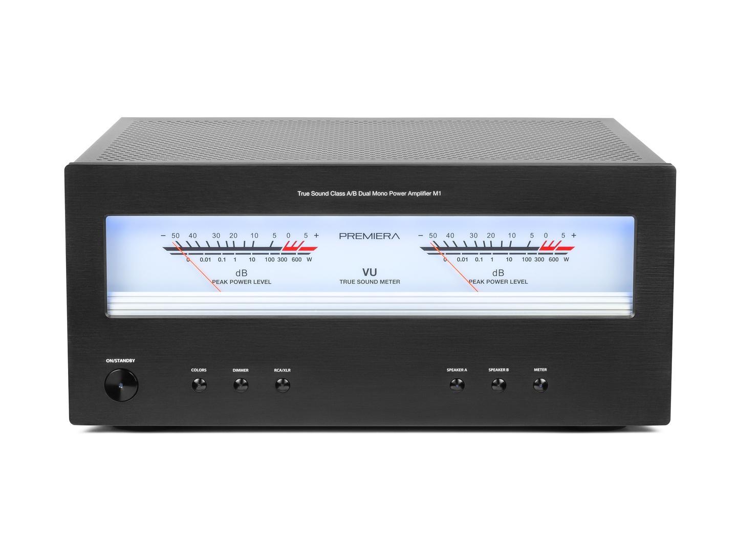 Premiera M1 – современный Hi-Fi стереоусилитель мощности класса AB с номинальной выходной мощностью 260 Вт на канал, с балансными и небалансными линейными входами.