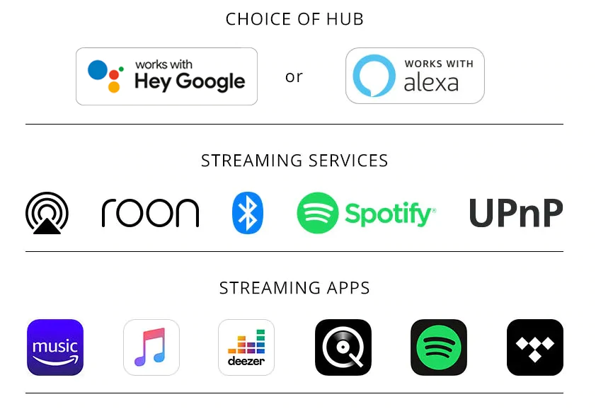 Кроме того, поддерживается работа с популярными стриминговыми сервисами Qobuz, Spotify, Tidal, Apple Music, Deezer и Amazon Music, а также воспроизведение контента с серверов домашней компьютерной сети через UPnP. Обе модели поддерживают голосовых помощников Google Assistant, Siri и Amazon Alexa.