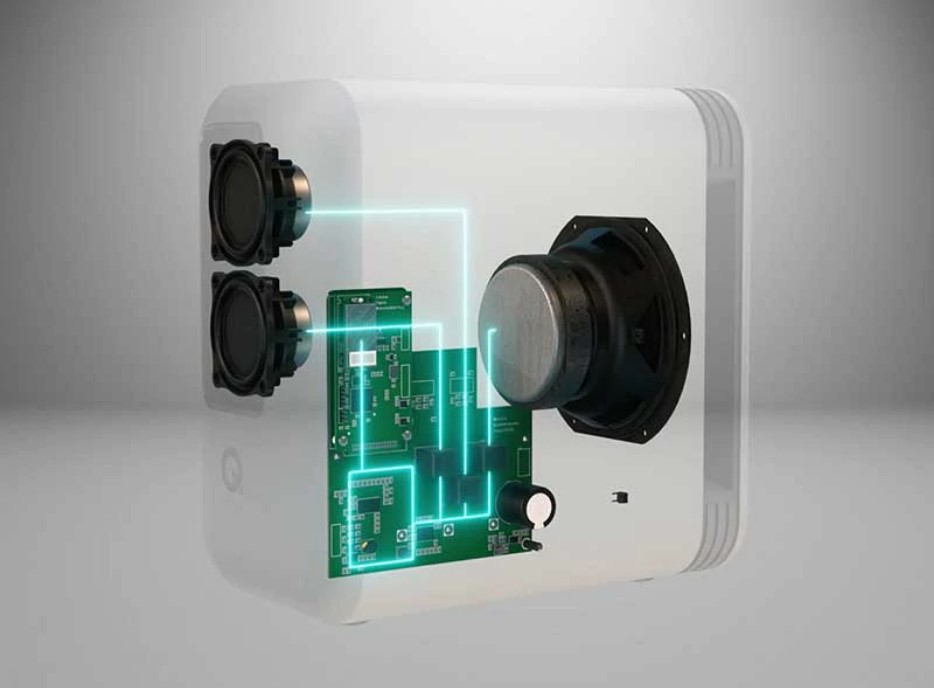 Используются усилительные модули, работающие в классе D, и реализовано полосное усиление с активным кроссовером на основе DSP. В полочной модели Q Active 200 работают шесть усилителей общей мощностью 280 Вт,