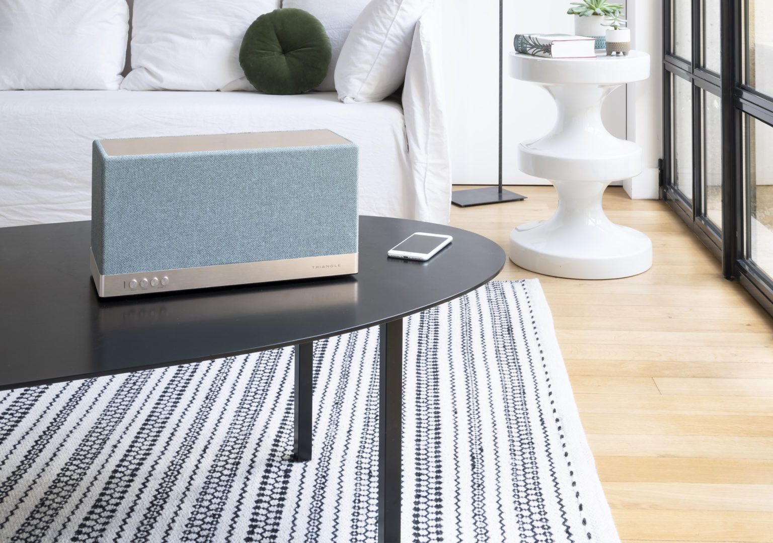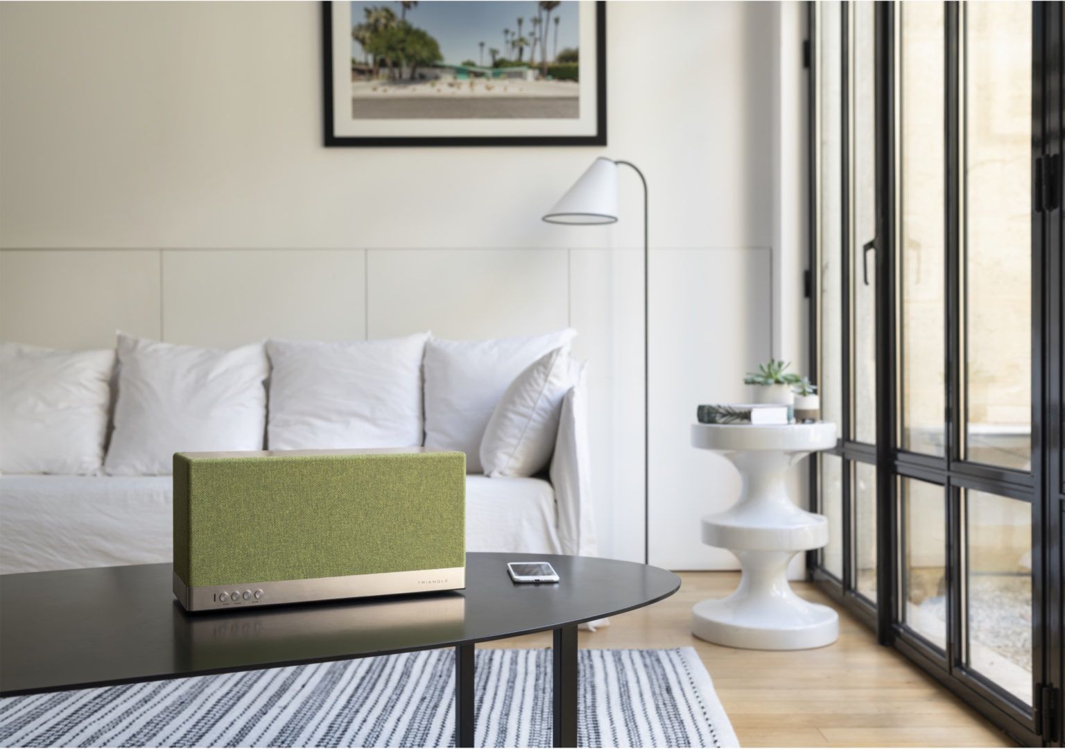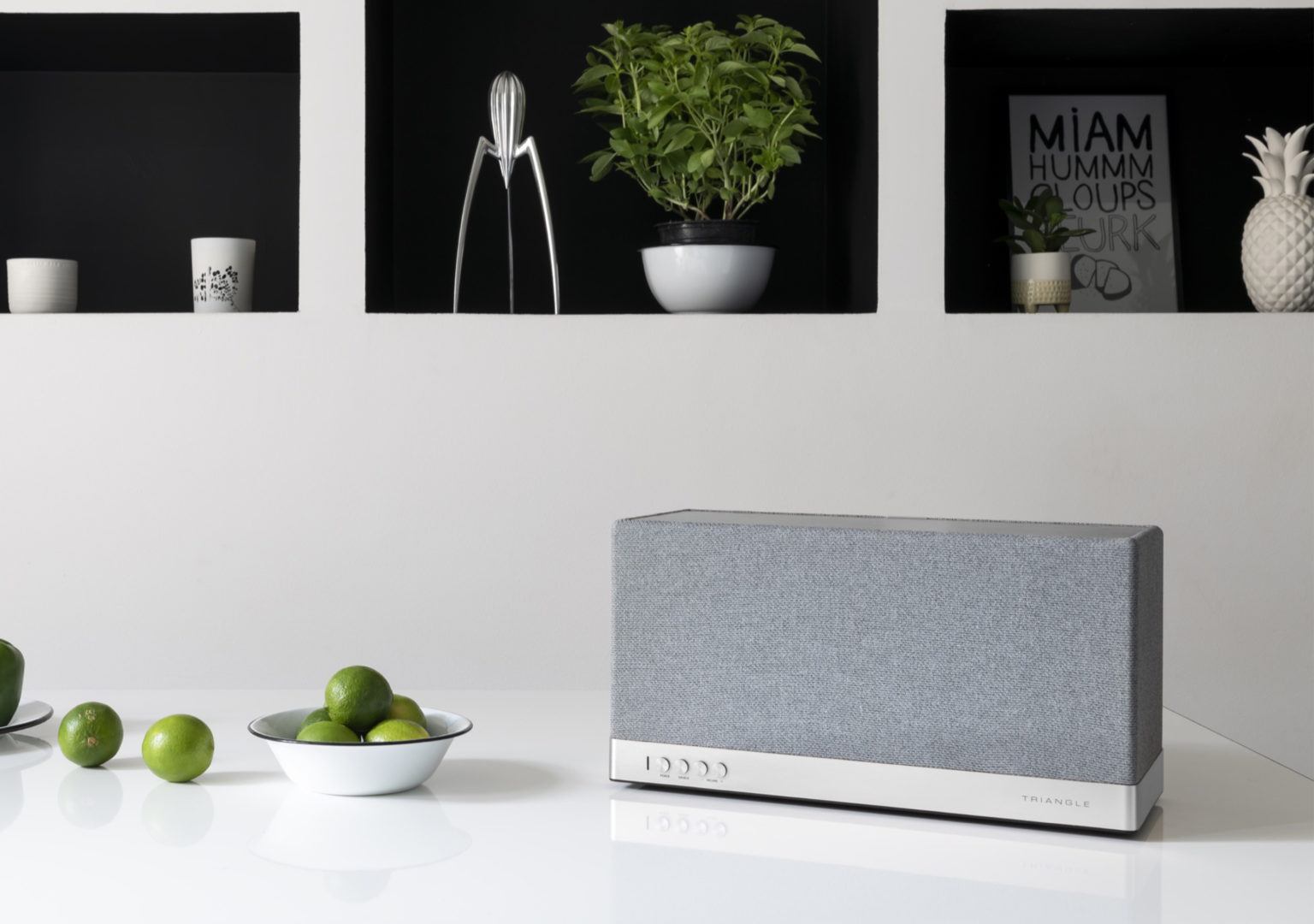 Управлять полным набором функций колонки удобнее всего через шустрое фирменное приложение AIO от Triangle, поддерживает iOS и Android (приложение бесплатное). Для любителей аналоговой эстетики — на передней панели колонки расположены несколько кнопок включения, переключения режимов и регулировки. В аудиосистеме предусмотрели будильник и режим сна.