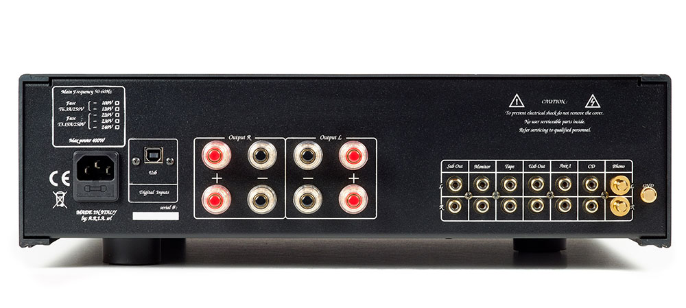 Гибридный интегральный усилитель, ЦАП, выходная мощность: 2 х 100 Вт (8 Ом), диапазон частот: 10 Гц — 100 кГц, гармоники: 0,5%, входной импеданс: 50 кОм / 50 пкФ, ламповая комплектация: 2 x ECC83 (12AX7) (Dynamic A Class Power BJT, Super-Symmetric), фонокорректор: ММ-тип, аудио входы: 5 х RCA, 1 х USB тип В, габариты: 435 x 430 x 130 мм, варианты цветов: серебристый, черный.